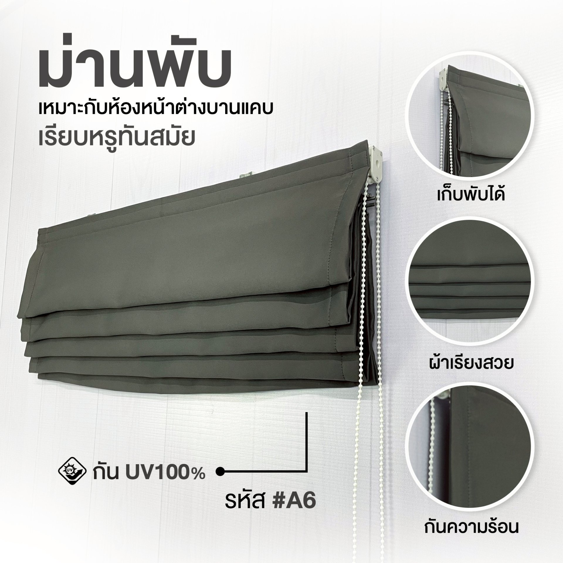 ผ้าม่านพับ สีเทาเข้ม รหัส A6 เป็นตัวเลือกที่ผสมผสานทั้งความ เรียบหรู และ ฟังก์ชันการใช้งานครบครัน ตอบโจทย์บ้านสไตล์โมเดิร์น มินิมอล หรือคอนโดฯ ดีไซน์ใหม่ ด้วยคุณสมบัติการกันแสงกันยูวี ดูแลรักษาง่าย และติดตั้งรวดเร็ว ทำให้บ้านของคุณดูดีมีสไตล์ในทุกมุม ไม่ว่าจะเป็นพื้นที่รับแขก มุมพักผ่อน หรือมุมทำงาน