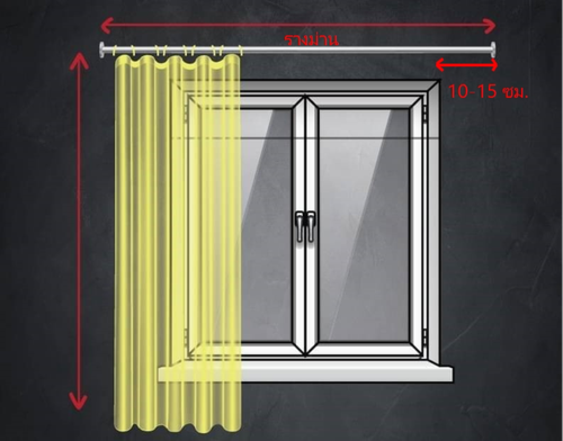เผื่อความยาวไว้ให้ม่านทิ้งตัวสวยงาม (ปกติประมาณ 10-30 ซม. หรือลากถึงพื้นสำหรับม่านยาว)