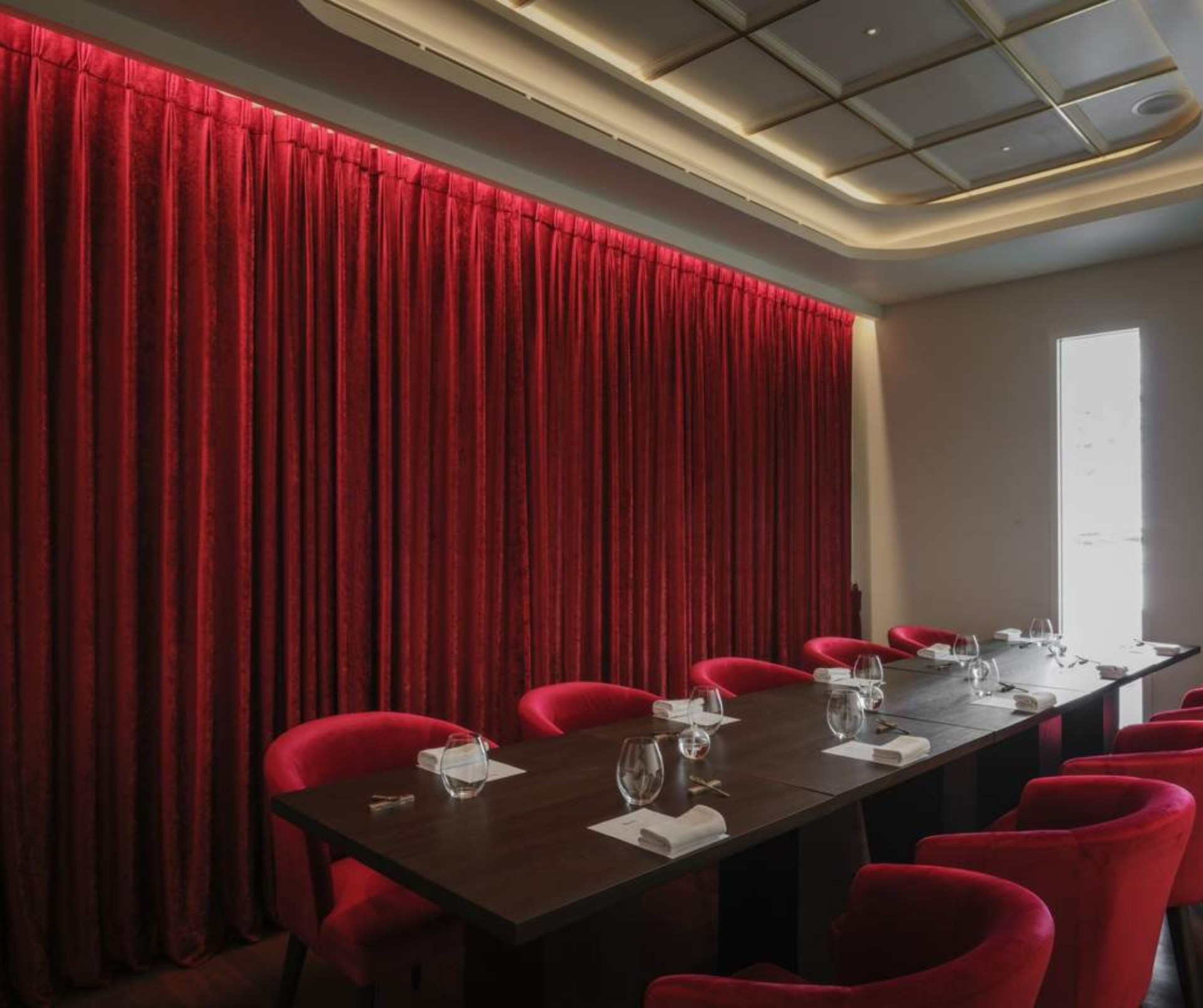 ร้านอาหารหรู Fine Dining ม่านกำมะหยี่ เทาเข้ม ทอง เบอร์กันดี